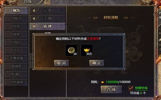 2、右下角提示背包和身上的材料和元宝足够合成目标装备数量