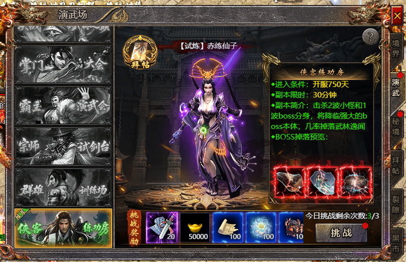 - 开服750天后,开启演武场副本玩法,演武场副本为个人副本,副本挑战时限为30分钟,每日有三次挑战次数,副本内怪物会掉落武道装备以及武道相关道具