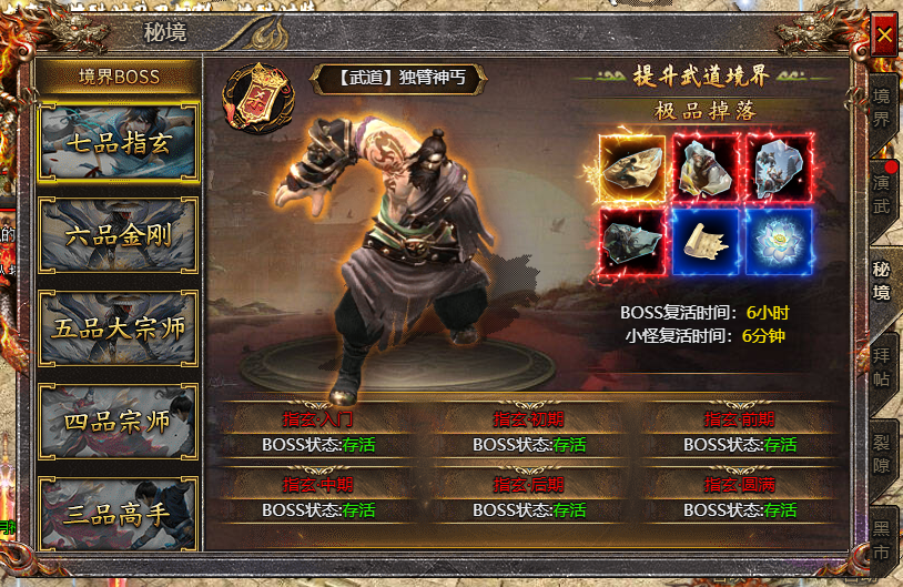 - 开服750天后,开启武道秘境副本玩法,副本内怪物会掉落武道装备以及武道相关道具