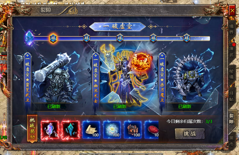 - 每轮试炼需要面对若干波伤害,抗下所有波次即可完成本轮虚空试炼,突破成功可获得大量属性以及强力buff。
