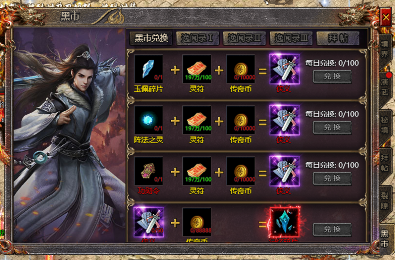 - 开服750天后,开启黑市兑换系统,可以消耗武道相关道具兑换拜帖以及更高阶级的武林装备