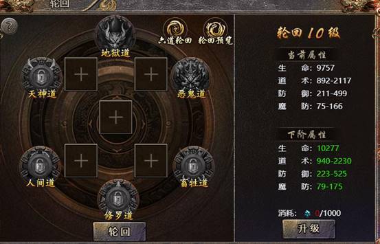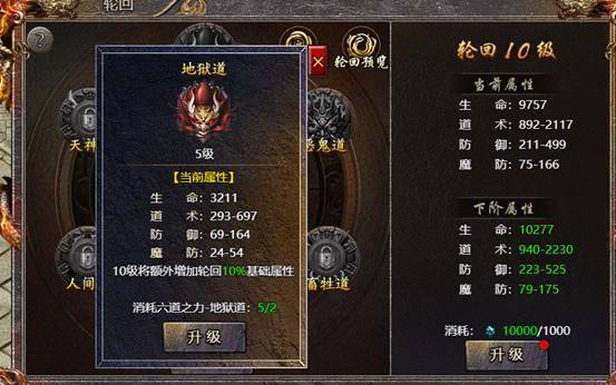 4、玩家将六道升至10级后可额外增加轮回系统额外属性