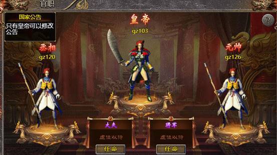 3、皇帝、丞相、元帅由每个国家攻击力最高的3个人当选,由系统每日0点自动分