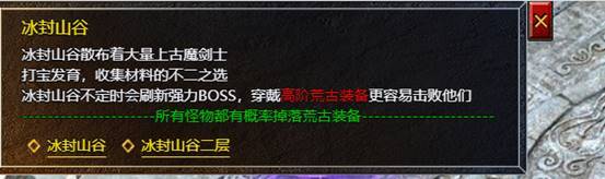 3、新增地图冰封平原二层,冰封平原有大量的上古魔剑士怪怪物,有概率掉落荒古神装,玩家需要集齐更高阶的荒古装备才能挑战更强的魔盾怪