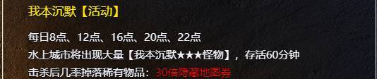1、开服34天后,水上城市每天会刷新我本沉默怪物