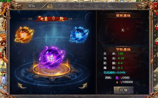 1、消耗精魄可以升级星辰系统,升级后会获得大量属性;