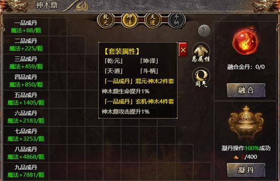 6、当各个神木鼎完成对应品阶丹药凝练后,可激活同气套装,获得更多强力属性