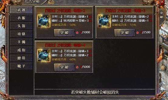 5、装备突破:玩家可以在凛冬遗迹找到荒古装备突破NPC进行装备突破,需要集齐主材料和辅材料才能进行突破,装备突破有概率失败,若突破失败辅材料会破损消失,主材料会保留