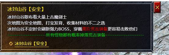 3、新增地图冰封平原二层,冰封平原有大量的上古魔剑士怪怪物,有概率掉落荒古神装,玩家需要集齐更高阶的荒古装备才能挑战更强的魔盾怪